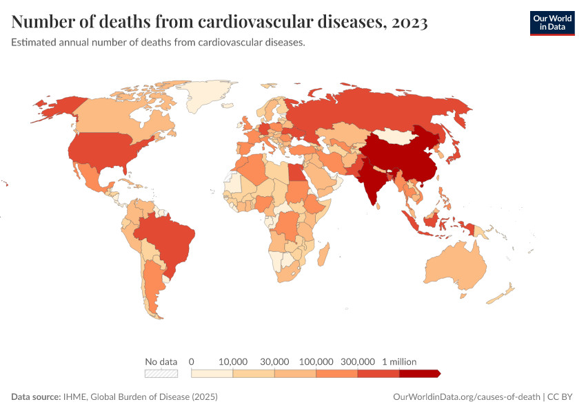 “Data Page: Number of deaths from cardiovascular diseases”, part of the following publication: Esteban Ortiz-Ospina and Max Roser (2016) - “Global Health”. Data adapted from IHME, Global Burden of Disease. Retrieved from https://who-regions.owid.pages.dev:8789/20260304-094028/grapher/deaths-from-cardiovascular-disease.html [online resource] (archived on March 4, 2026).How to cite this data