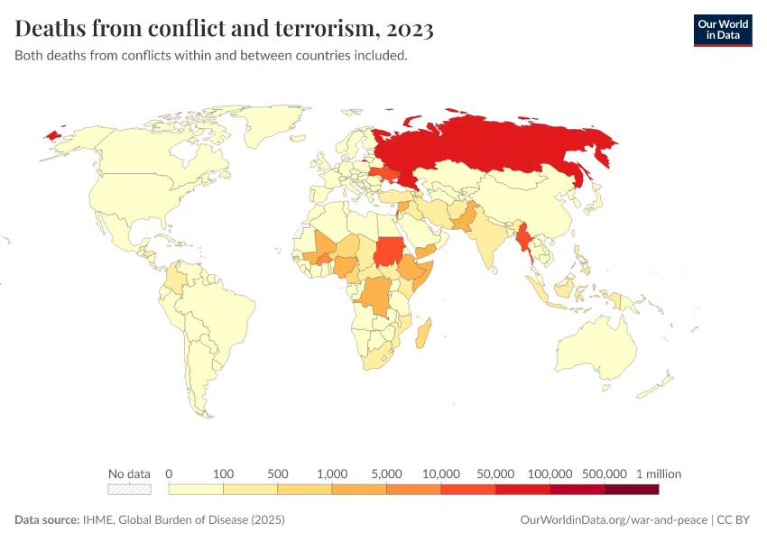 IHME, Global Burden of Disease (2025) – with major processing by Our World in Data. “Deaths from conflict and terrorism” [dataset]. IHME, Global Burden of Disease, “Global Burden of Disease - Deaths” [original data]. Retrieved March 10, 2026 from https://who-regions.owid.pages.dev:8789/20260304-094028/grapher/deaths-from-conflict-and-terrorism.html (archived on March 4, 2026).