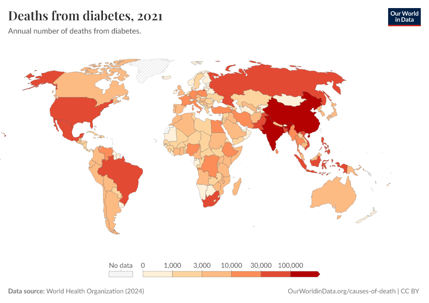 “Data Page: Deaths from diabetes”, part of the following publication: Esteban Ortiz-Ospina and Max Roser (2016) - “Global Health”. Data adapted from World Health Organization. Retrieved from https://who-regions.owid.pages.dev:8789/20260304-094028/grapher/deaths-from-diabetes-ghe.html [online resource] (archived on March 4, 2026).How to cite this data