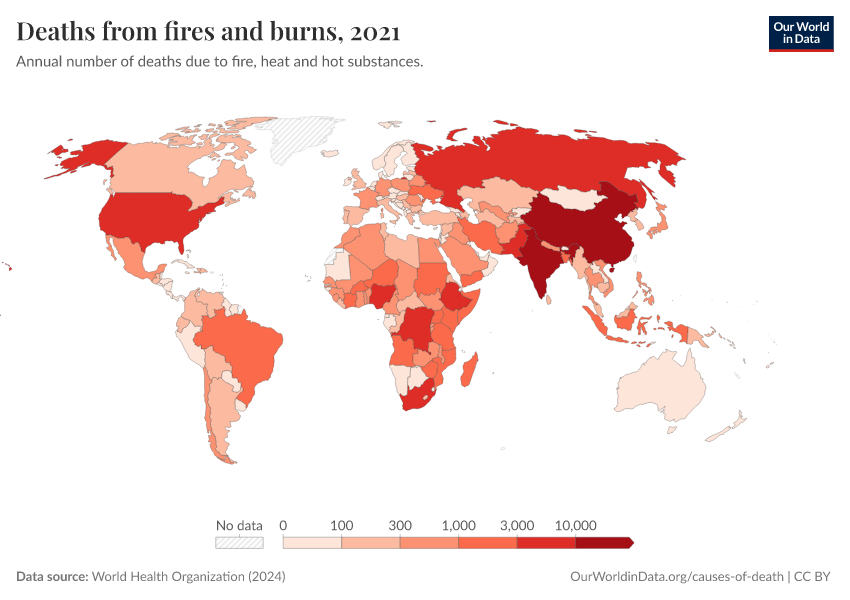 “Data Page: Deaths from fires and burns”, part of the following publication: Esteban Ortiz-Ospina and Max Roser (2016) - “Global Health”. Data adapted from World Health Organization. Retrieved from https://who-regions.owid.pages.dev:8789/20260304-094028/grapher/deaths-from-fires-and-burns-who.html [online resource] (archived on March 4, 2026).How to cite this data