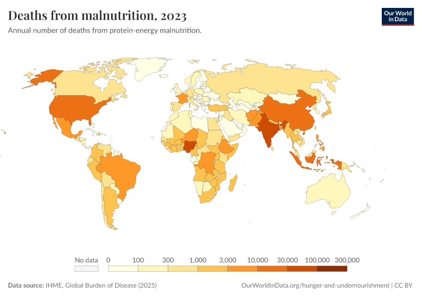 IHME, Global Burden of Disease (2025) – with major processing by Our World in Data. “Deaths from malnutrition” [dataset]. IHME, Global Burden of Disease, “Global Burden of Disease - Deaths” [original data]. Retrieved March 10, 2026 from https://who-regions.owid.pages.dev:8789/20260304-094028/grapher/deaths-from-malnutrition.html (archived on March 4, 2026).