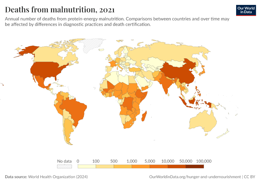 World Health Organization (2024) – with major processing by Our World in Data. “Deaths from malnutrition” [dataset]. World Health Organization, “Global Health Estimates” [original data]. Retrieved March 10, 2026 from https://who-regions.owid.pages.dev:8789/20260304-094028/grapher/deaths-from-malnutrition-ghe.html (archived on March 4, 2026).
