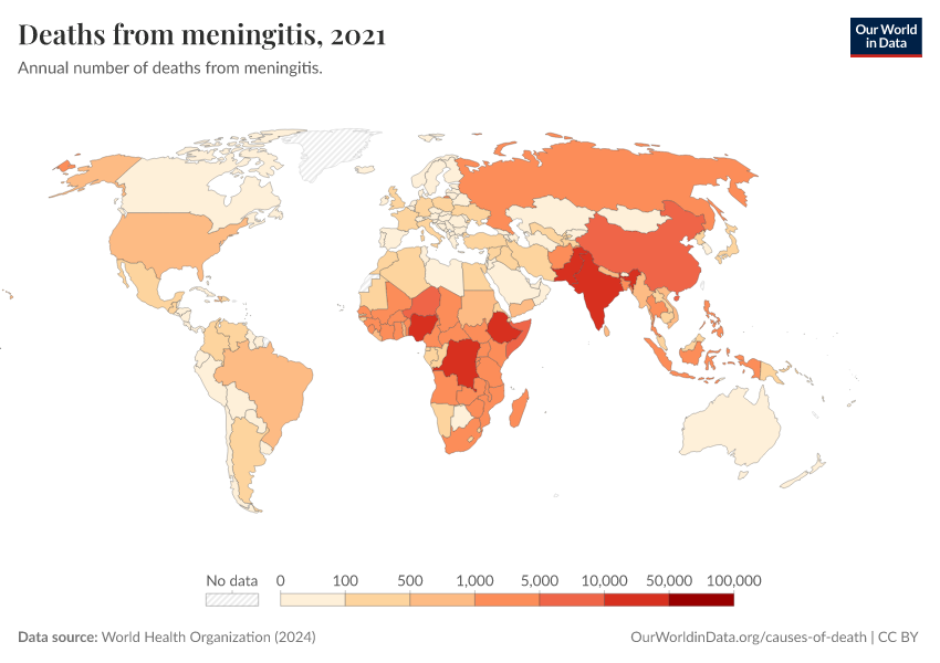 “Data Page: Deaths from meningitis”, part of the following publication: Esteban Ortiz-Ospina and Max Roser (2016) - “Global Health”. Data adapted from World Health Organization. Retrieved from https://who-regions.owid.pages.dev:8789/20260304-094028/grapher/deaths-from-meningitis-ghe.html [online resource] (archived on March 4, 2026).How to cite this data