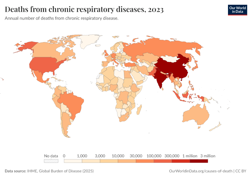 IHME, Global Burden of Disease (2025) – with major processing by Our World in Data. “Deaths from chronic respiratory diseases” [dataset]. IHME, Global Burden of Disease, “Global Burden of Disease - Deaths” [original data]. Retrieved March 10, 2026 from https://who-regions.owid.pages.dev:8789/20260304-094028/grapher/deaths-from-respiratory-disease.html (archived on March 4, 2026).