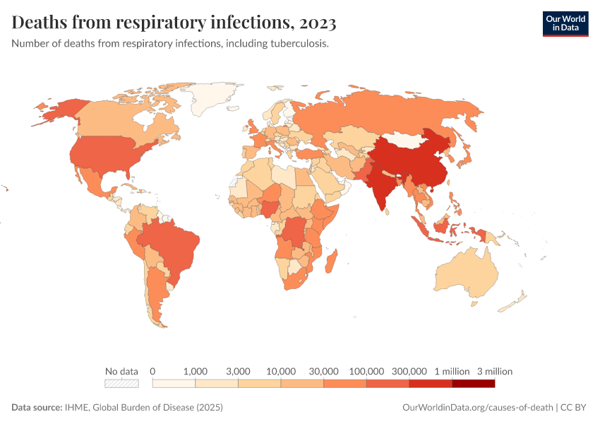“Data Page: Deaths from respiratory infections”, part of the following publication: Esteban Ortiz-Ospina and Max Roser (2016) - “Global Health”. Data adapted from IHME, Global Burden of Disease. Retrieved from https://who-regions.owid.pages.dev:8789/20260304-094028/grapher/deaths-from-respiratory-infections.html [online resource] (archived on March 4, 2026).How to cite this data