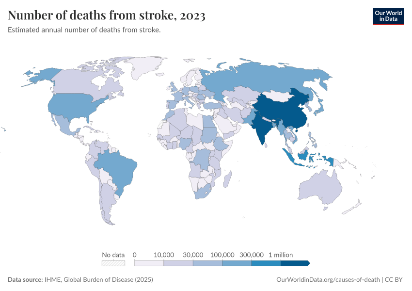 IHME, Global Burden of Disease (2025) – with major processing by Our World in Data. “Number of deaths from stroke” [dataset]. IHME, Global Burden of Disease, “Global Burden of Disease - Deaths” [original data]. Retrieved March 10, 2026 from https://who-regions.owid.pages.dev:8789/20260304-094028/grapher/deaths-from-strokes.html (archived on March 4, 2026).