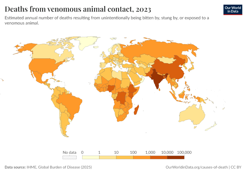 IHME, Global Burden of Disease (2025) – with major processing by Our World in Data. “Deaths from venomous animal contact” [dataset]. IHME, Global Burden of Disease, “Global Burden of Disease - Deaths” [original data]. Retrieved March 10, 2026 from https://who-regions.owid.pages.dev:8789/20260304-094028/grapher/deaths-from-venomous-animal-contact.html (archived on March 4, 2026).
