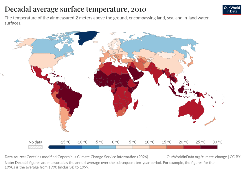 “Data Page: Decadal average surface temperature”, part of the following publication: Hannah Ritchie, Pablo Rosado, and Veronika Samborska (2024) - “Climate Change”. Data adapted from Contains modified Copernicus Climate Change Service information. Retrieved from https://who-regions.owid.pages.dev:8789/20260304-094028/grapher/decadal-average-surface-temperature.html [online resource] (archived on March 4, 2026).How to cite this data