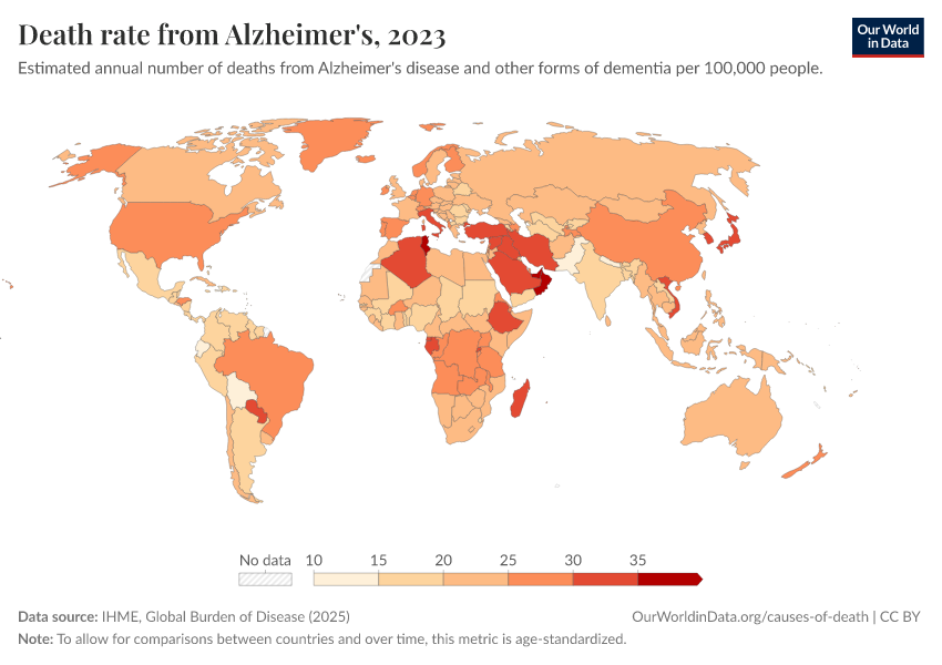IHME, Global Burden of Disease (2025) – with major processing by Our World in Data. “Death rate from Alzheimer's” [dataset]. IHME, Global Burden of Disease, “Global Burden of Disease - Deaths” [original data]. Retrieved March 10, 2026 from https://who-regions.owid.pages.dev:8789/20260304-094028/grapher/dementia-death-rates.html (archived on March 4, 2026).