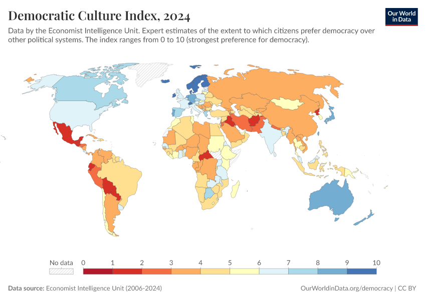 “Data Page: Democratic Culture Index”, part of the following publication: Bastian Herre, Lucas Rodés-Guirao, and Esteban Ortiz-Ospina (2013) - “Democracy”. Data adapted from Economist Intelligence Unit, Gapminder, Various sources. Retrieved from https://who-regions.owid.pages.dev:8789/20260304-094028/grapher/democratic-culture-index-eiu.html [online resource] (archived on March 4, 2026).How to cite this data