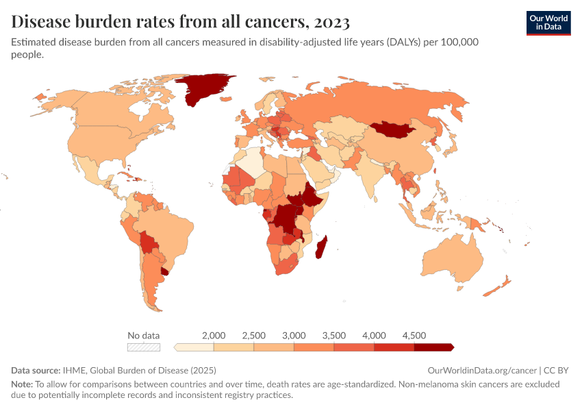IHME, Global Burden of Disease (2025) – with major processing by Our World in Data. “Disease burden rates from all cancers” [dataset]. IHME, Global Burden of Disease, “Global Burden of Disease - DALYs” [original data]. Retrieved March 9, 2026 from https://who-regions.owid.pages.dev:8789/20260304-094028/grapher/disease-burden-rates-from-cancers.html (archived on March 4, 2026).