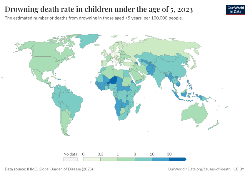 IHME, Global Burden of Disease (2025) – with major processing by Our World in Data. “Drowning death rate in children under the age of 5” [dataset]. IHME, Global Burden of Disease, “Global Burden of Disease - Deaths” [original data]. Retrieved March 9, 2026 from https://who-regions.owid.pages.dev:8789/20260304-094028/grapher/drowning-death-rates-under-5.html (archived on March 4, 2026).
