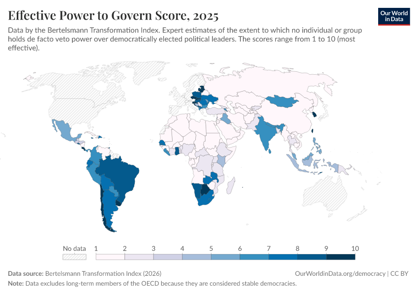 “Data Page: Effective Power to Govern Score”, part of the following publication: Bastian Herre, Lucas Rodés-Guirao, and Esteban Ortiz-Ospina (2013) - “Democracy”. Data adapted from Bertelsmann Transformation Index. Retrieved from https://who-regions.owid.pages.dev:8789/20260304-094028/grapher/effective-power-to-govern-score-bti.html [online resource] (archived on March 4, 2026).How to cite this data