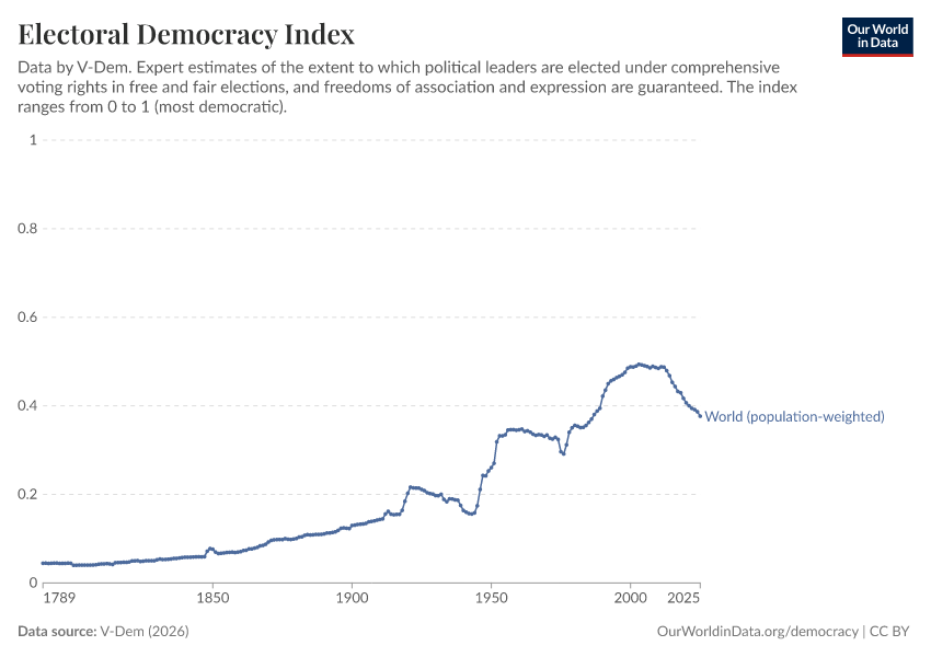 “Data Page: Electoral democracy index”, part of the following publication: Bastian Herre, Lucas Rodés-Guirao, and Esteban Ortiz-Ospina (2013) - “Democracy”. Data adapted from V-Dem. Retrieved from https://who-regions.owid.pages.dev:8789/20260304-094028/grapher/electoral-democracy-index.html [online resource] (archived on March 4, 2026).How to cite this data