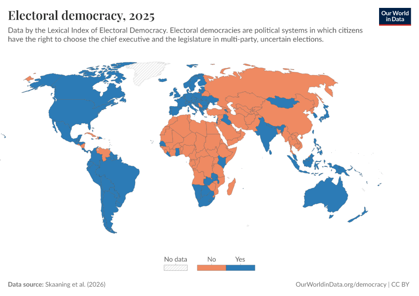 Skaaning et al. (2025) – processed by Our World in Data. “Electoral democracy” [dataset]. Skaaning et al., “Lexical Index of Electoral Democracy (LIED) v6.8” [original data]. Retrieved March 9, 2026 from https://who-regions.owid.pages.dev:8789/20260304-094028/grapher/electoral-democracy-lexical.html (archived on March 4, 2026).