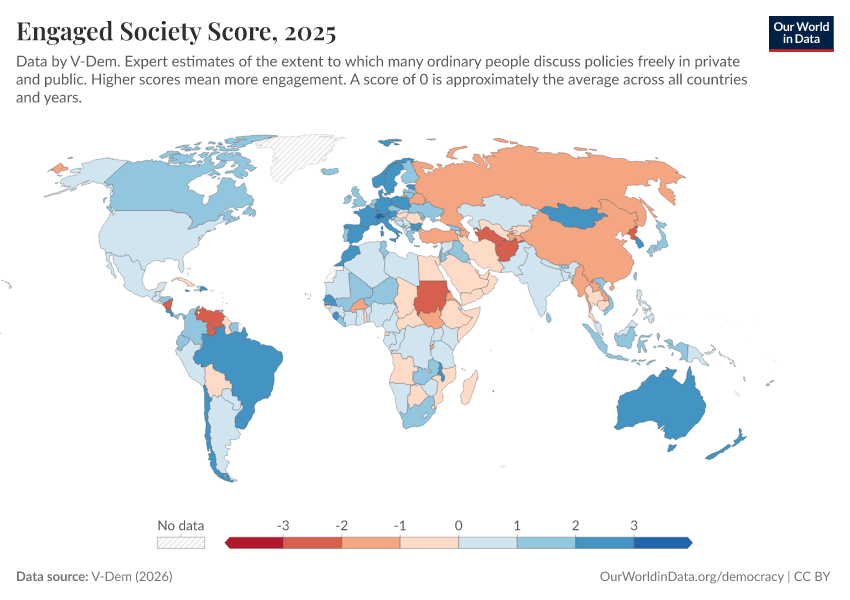 “Data Page: Engaged society”, part of the following publication: Bastian Herre, Lucas Rodés-Guirao, and Esteban Ortiz-Ospina (2013) - “Democracy”. Data adapted from V-Dem. Retrieved from https://who-regions.owid.pages.dev:8789/20260304-094028/grapher/engaged-society-score.html [online resource] (archived on March 4, 2026).How to cite this data
