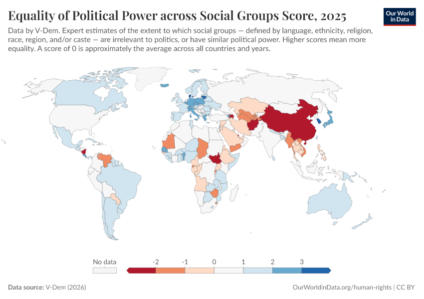 “Data Page: Equality of political power across social groups”, part of the following publication: Bastian Herre, Lucas Rodés-Guirao, and Esteban Ortiz-Ospina (2013) - “Democracy”. Data adapted from V-Dem. Retrieved from https://who-regions.owid.pages.dev:8789/20260304-094028/grapher/equality-of-political-power-across-social-groups-score.html [online resource] (archived on March 4, 2026).How to cite this data