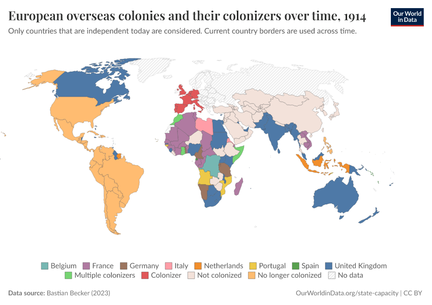 “Data Page: European overseas colonies and their colonizers over time”, part of the following publication: Bastian Herre and Pablo Arriagada (2023) - “State Capacity”. Data adapted from Bastian Becker. Retrieved from https://who-regions.owid.pages.dev:8789/20260304-094028/grapher/european-overseas-colonies-and-their-colonizers.html [online resource] (archived on March 4, 2026).How to cite this data