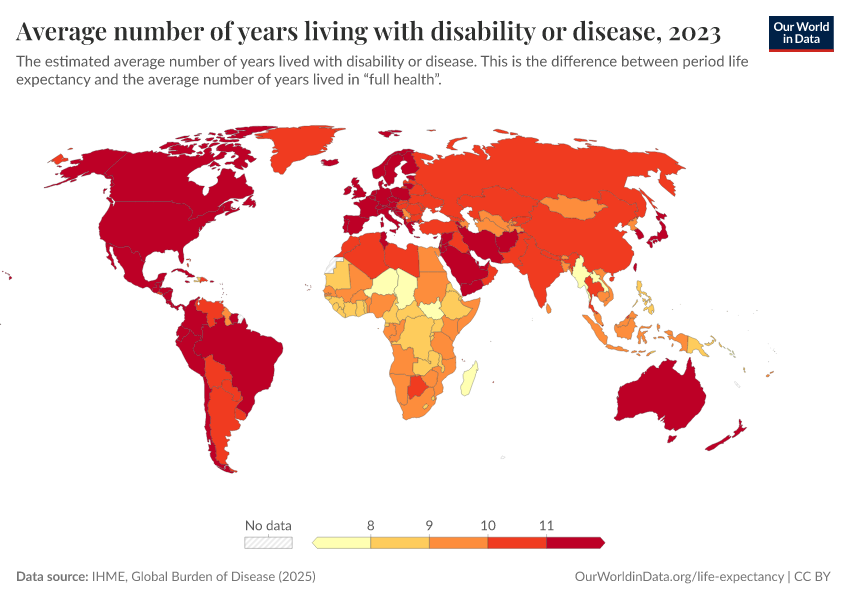 “Data Page: Average number of years living with disability or disease”, part of the following publication: Saloni Dattani, Lucas Rodés-Guirao, Hannah Ritchie, Esteban Ortiz-Ospina, and Max Roser (2023) - “Life Expectancy”. Data adapted from IHME, Global Burden of Disease. Retrieved from https://who-regions.owid.pages.dev:8789/20260304-094028/grapher/expected-years-of-living-with-disability-or-disease-burden.html [online resource] (archived on March 4, 2026).How to cite this data