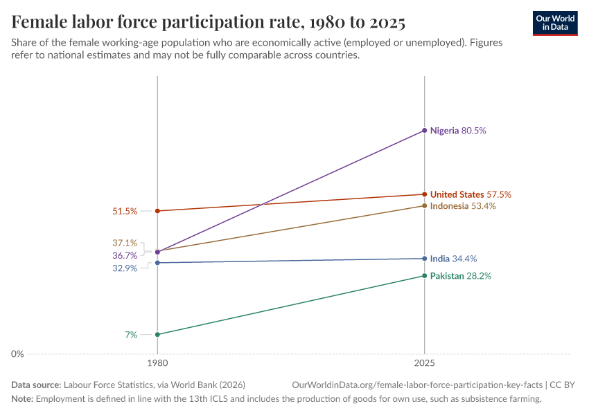 Labour Force Statistics, via World Bank (2026) – processed by Our World in Data. “Female labor force participation rate – ILO” [dataset]. Labour Force Statistics, via World Bank, “World Development Indicators 125” [original data]. Retrieved March 9, 2026 from https://who-regions.owid.pages.dev:8789/20260304-094028/grapher/female-labor-force-participation-rates-slopes.html (archived on March 4, 2026).