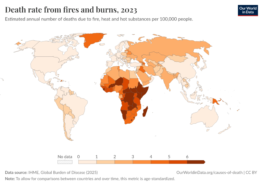 IHME, Global Burden of Disease (2025) – with major processing by Our World in Data. “Death rate from fires and burns” [dataset]. IHME, Global Burden of Disease, “Global Burden of Disease - Deaths” [original data]. Retrieved March 9, 2026 from https://who-regions.owid.pages.dev:8789/20260304-094028/grapher/fire-death-rates.html (archived on March 4, 2026).