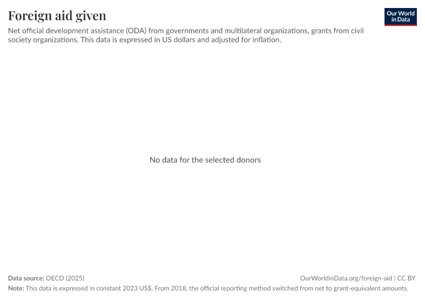 OECD (2025) – with major processing by Our World in Data. “Foreign aid given – Net disbursements” [dataset]. OECD, “OECD Official Development Assistance (ODA) - DAC1: Flows by provider (ODA+OOF+Private)”; OECD, “OECD Official Development Assistance (ODA) - DAC2A: Aid (ODA) disbursements to countries and regions” [original data]. Retrieved March 9, 2026 from https://who-regions.owid.pages.dev:8789/20260304-094028/grapher/foreign-aid-given-net.html (archived on March 4, 2026).