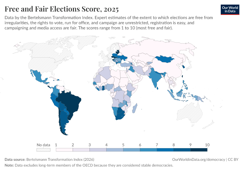 Bertelsmann Transformation Index (2024) – processed by Our World in Data. “Free and Fair Elections Score” [dataset]. Bertelsmann Transformation Index, “Bertelsmann Transformation Index, Scores” [original data]. Retrieved March 9, 2026 from https://who-regions.owid.pages.dev:8789/20260304-094028/grapher/free-fair-elections-bti.html (archived on March 4, 2026).