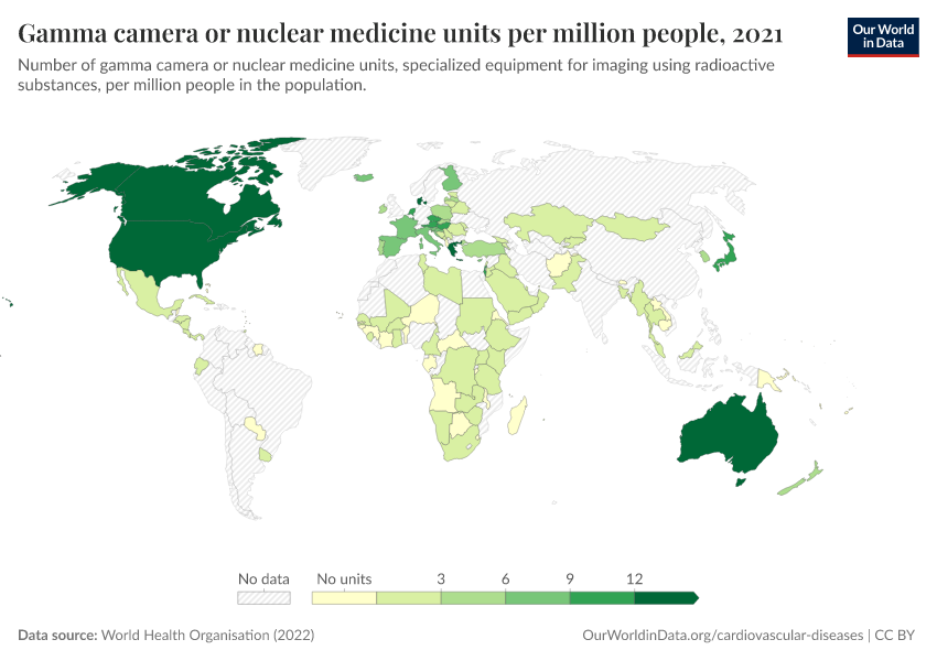 “Data Page: Gamma camera or nuclear medicine units per million people”, part of the following publication: Saloni Dattani, Veronika Samborska, Hannah Ritchie, and Max Roser (2023) - “Cardiovascular Diseases”. Data adapted from World Health Organisation. Retrieved from https://who-regions.owid.pages.dev:8789/20260304-094028/grapher/gamma-camera-or-nuclear-medicine-availability.html [online resource] (archived on March 4, 2026).How to cite this data