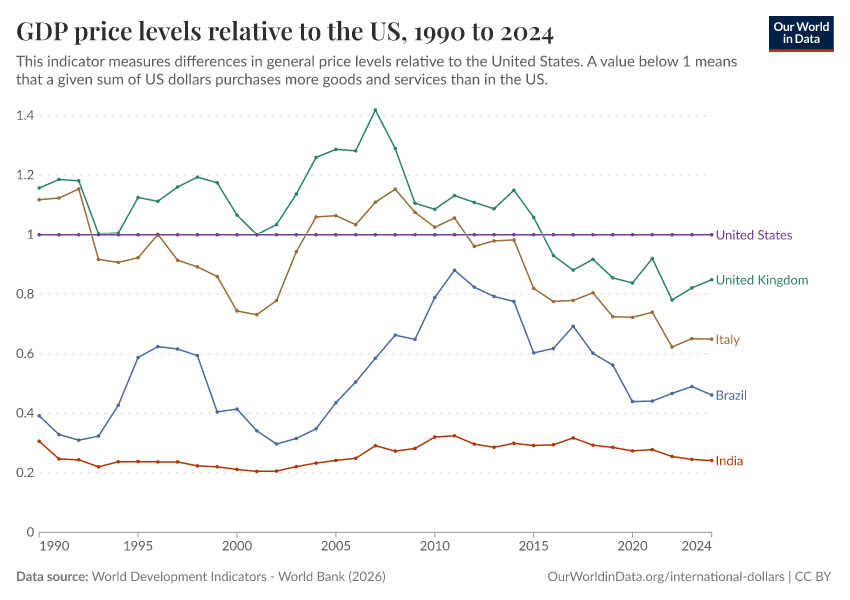 World Development Indicators - World Bank (2026) – processed by Our World in Data. “GDP price levels relative to the US – World Bank” [dataset]. World Development Indicators - World Bank, “World Development Indicators 125” [original data]. Retrieved March 9, 2026 from https://who-regions.owid.pages.dev:8789/20260304-094028/grapher/gdp-price-levels-relative-to-the-us.html (archived on March 4, 2026).