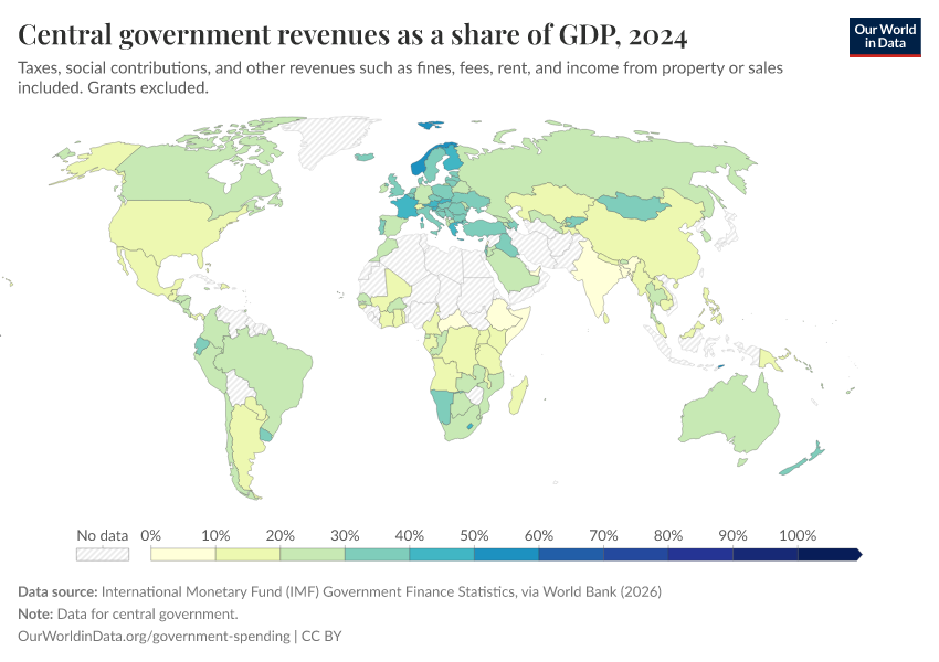 “Data Page: Central government revenues as a share of GDP”. Our World in Data (2026). Data adapted from International Monetary Fund (IMF) Government Finance Statistics, via World Bank. Retrieved from https://who-regions.owid.pages.dev:8789/20260304-094028/grapher/government-revenues-as-a-share-of-gdp-world-bank.html [online resource] (archived on March 4, 2026).How to cite this data