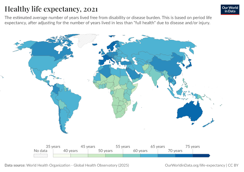 “Data Page: Healthy life expectancy”. Our World in Data (2026). Data adapted from World Health Organization. Retrieved from https://who-regions.owid.pages.dev:8789/20260304-094028/grapher/healthy-life-expectancy-at-birth.html [online resource] (archived on March 4, 2026).How to cite this data
