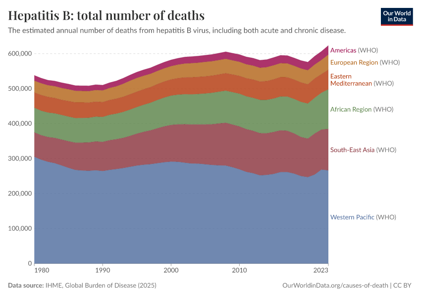 IHME, Global Burden of Disease (2025) – with major processing by Our World in Data. “Hepatitis B: total number of deaths” [dataset]. IHME, Global Burden of Disease, “Global Burden of Disease - Deaths” [original data]. Retrieved March 9, 2026 from https://who-regions.owid.pages.dev:8789/20260304-094028/grapher/hepatitis-b-number-of-deaths.html (archived on March 4, 2026).