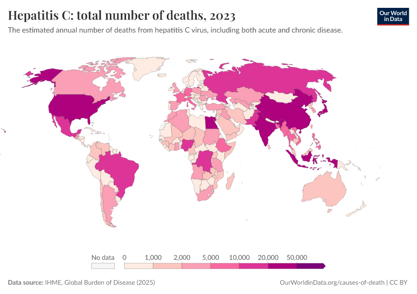 “Data Page: Hepatitis C: total number of deaths”, part of the following publication: Esteban Ortiz-Ospina and Max Roser (2016) - “Global Health”. Data adapted from IHME, Global Burden of Disease. Retrieved from https://who-regions.owid.pages.dev:8789/20260304-094028/grapher/hepatitis-c-number-of-deaths.html [online resource] (archived on March 4, 2026).How to cite this data