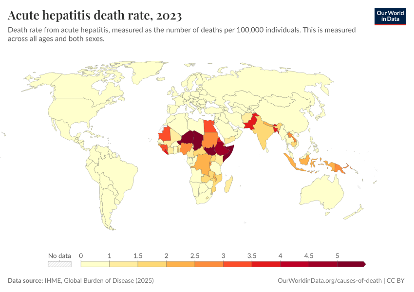 “Data Page: Acute hepatitis death rate”, part of the following publication: Esteban Ortiz-Ospina and Max Roser (2016) - “Global Health”. Data adapted from IHME, Global Burden of Disease. Retrieved from https://who-regions.owid.pages.dev:8789/20260304-094028/grapher/hepatitis-death-rate.html [online resource] (archived on March 4, 2026).How to cite this data