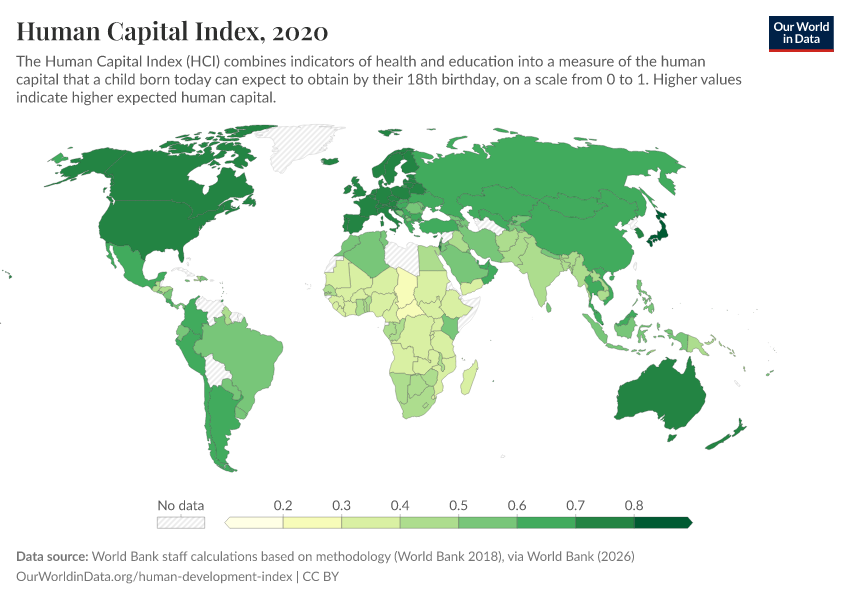 “Data Page: Human Capital Index”. Our World in Data (2026). Data adapted from World Bank staff calculations based on methodology (World Bank 2018), via World Bank. Retrieved from https://who-regions.owid.pages.dev:8789/20260304-094028/grapher/human-capital-index-in-2018.html [online resource] (archived on March 4, 2026).How to cite this data