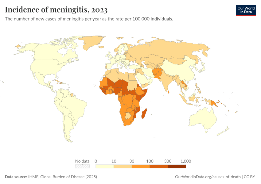 “Data Page: Incidence of meningitis”, part of the following publication: Esteban Ortiz-Ospina and Max Roser (2016) - “Global Health”. Data adapted from IHME, Global Burden of Disease. Retrieved from https://who-regions.owid.pages.dev:8789/20260304-094028/grapher/incidence-of-meningitis.html [online resource] (archived on March 4, 2026).How to cite this data