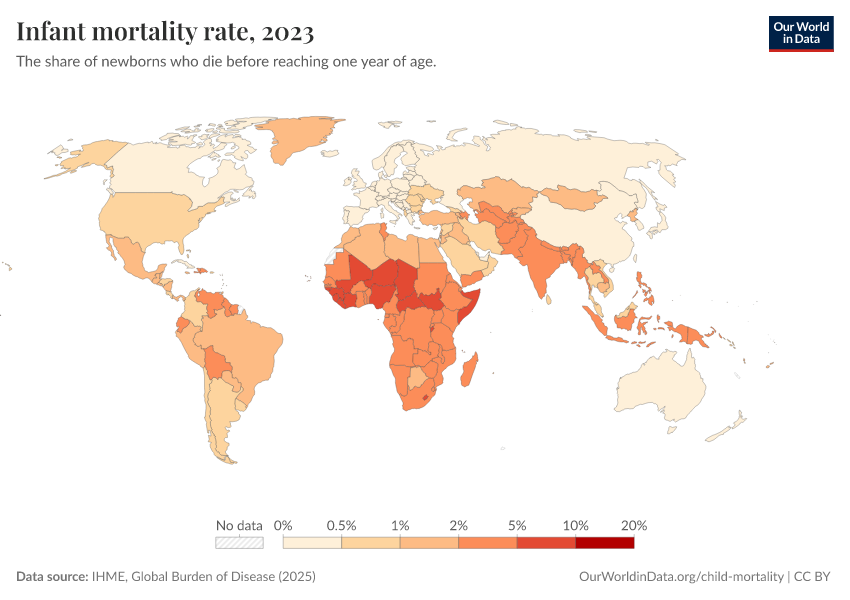 IHME, Global Burden of Disease (2025) – with minor processing by Our World in Data. “Infant mortality rate” [dataset]. IHME, Global Burden of Disease, “Global Burden of Disease - Child Mortality” [original data]. Retrieved March 9, 2026 from https://who-regions.owid.pages.dev:8789/20260304-094028/grapher/infant-mortality-rate.html (archived on March 4, 2026).