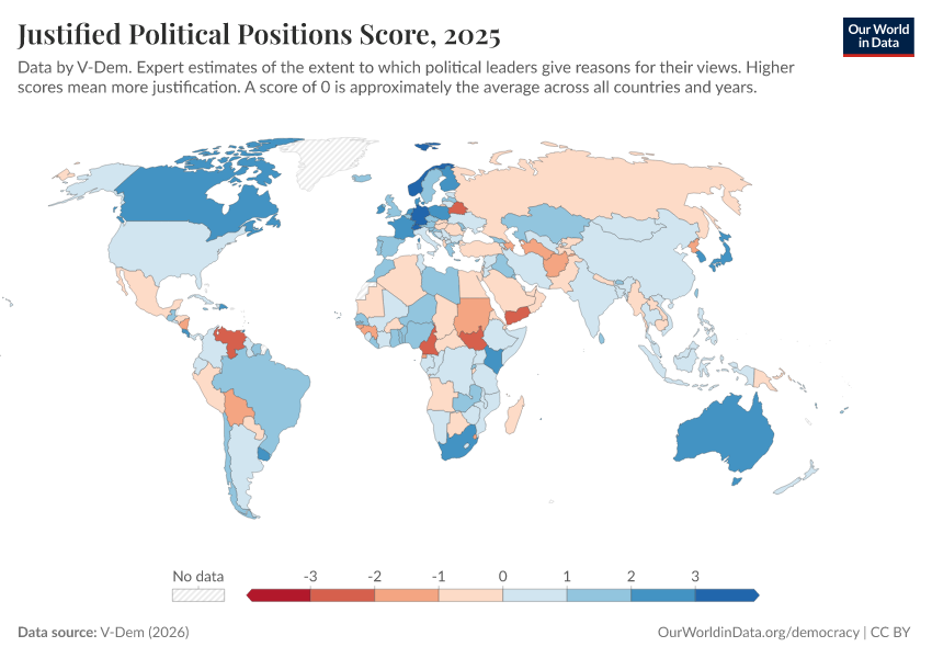 “Data Page: Justified political positions”, part of the following publication: Bastian Herre, Lucas Rodés-Guirao, and Esteban Ortiz-Ospina (2013) - “Democracy”. Data adapted from V-Dem. Retrieved from https://who-regions.owid.pages.dev:8789/20260304-094028/grapher/justified-political-positions-score.html [online resource] (archived on March 4, 2026).How to cite this data