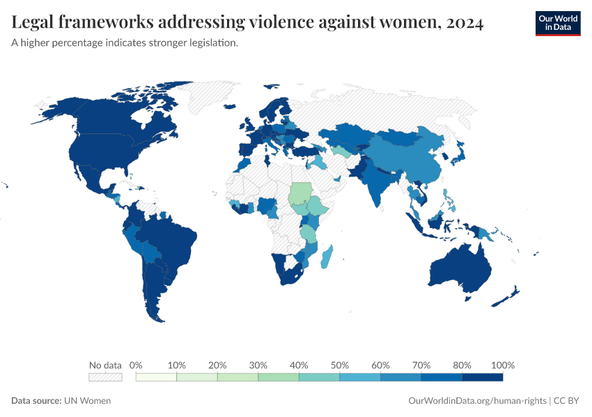 “Data Page: Legal frameworks addressing violence against women”. Our World in Data (2026). Data adapted from UN Women. Retrieved from https://who-regions.owid.pages.dev:8789/20260304-094028/grapher/legal-frameworks-regarding-violence-against-women.html [online resource] (archived on March 4, 2026).How to cite this data