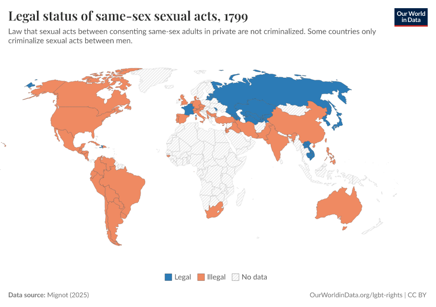 “Data Page: Legal status of same-sex sexual acts”, part of the following publication: Bastian Herre and Pablo Arriagada (2023) - “LGBT+ Rights”. Data adapted from Mignot. Retrieved from https://who-regions.owid.pages.dev:8789/20260304-094028/grapher/legal-status-of-same-sex-sexual-acts.html [online resource] (archived on March 4, 2026).How to cite this data