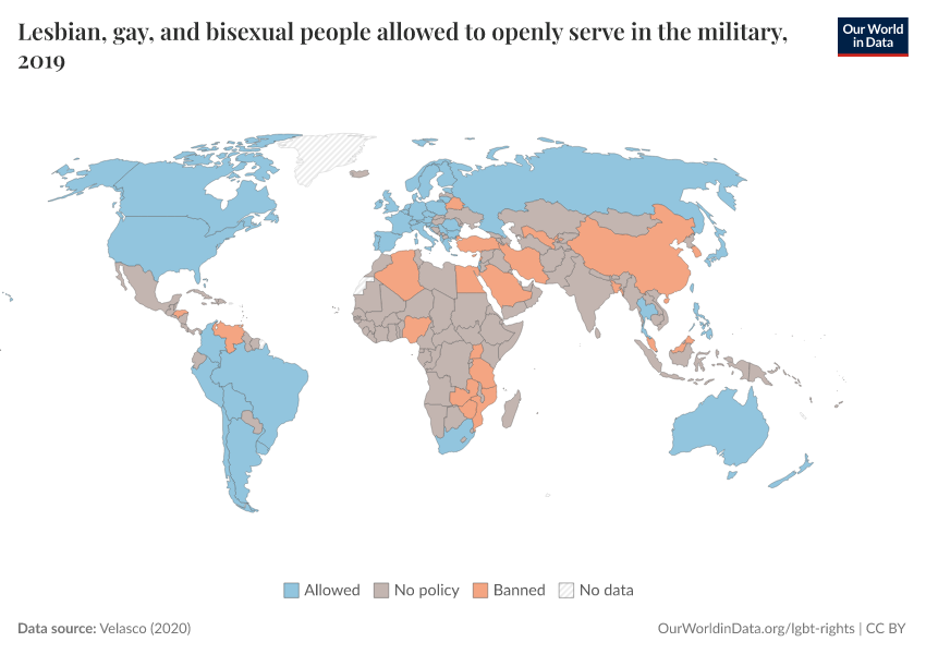 “Data Page: Lesbian, gay, and bisexual people allowed to openly serve in the military”, part of the following publication: Bastian Herre and Pablo Arriagada (2023) - “LGBT+ Rights”. Data adapted from Velasco. Retrieved from https://who-regions.owid.pages.dev:8789/20260304-094028/grapher/lgb-military-velasco.html [online resource] (archived on March 4, 2026).How to cite this data