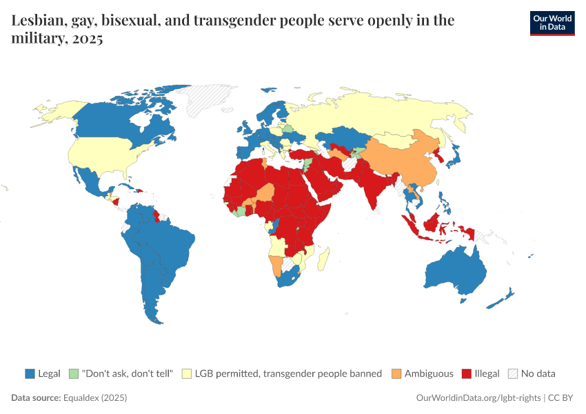 “Data Page: Lesbian, gay, bisexual, and transgender people serve openly in the military”, part of the following publication: Bastian Herre and Pablo Arriagada (2023) - “LGBT+ Rights”. Data adapted from Equaldex. Retrieved from https://who-regions.owid.pages.dev:8789/20260304-094028/grapher/lgbt-military-equaldex.html [online resource] (archived on March 4, 2026).How to cite this data