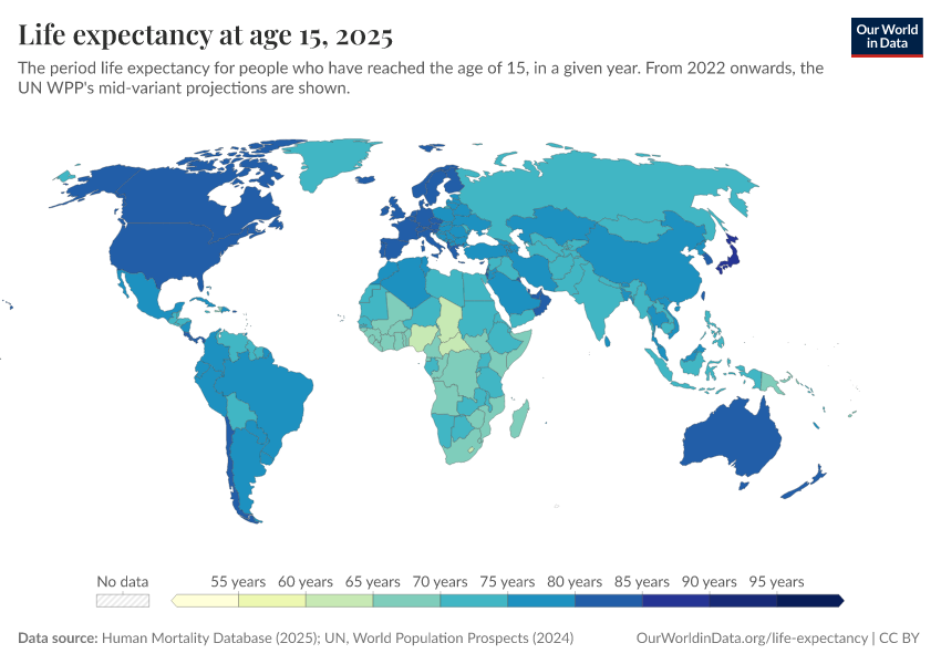 “Data Page: Life expectancy at 15”, part of the following publication: Saloni Dattani, Lucas Rodés-Guirao, Hannah Ritchie, Esteban Ortiz-Ospina, and Max Roser (2023) - “Life Expectancy”. Data adapted from Human Mortality Database, United Nations. Retrieved from https://who-regions.owid.pages.dev:8789/20260304-094028/grapher/life-expectancy-at-age-15.html [online resource] (archived on March 4, 2026).How to cite this data