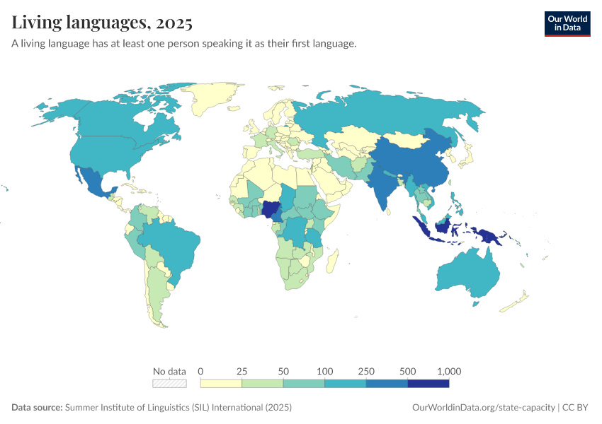 “Data Page: Living languages”, part of the following publication: Bastian Herre and Pablo Arriagada (2023) - “State Capacity”. Data adapted from Summer Institute of Linguistics (SIL) International. Retrieved from https://who-regions.owid.pages.dev:8789/20260304-094028/grapher/living-languages.html [online resource] (archived on March 4, 2026).How to cite this data