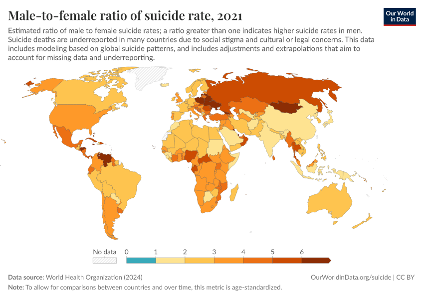 World Health Organization (2024) – with major processing by Our World in Data. “Male-to-female ratio of suicide rate” [dataset]. World Health Organization, “Global Health Estimates” [original data]. Retrieved March 9, 2026 from https://who-regions.owid.pages.dev:8789/20260304-094028/grapher/male-female-ratio-suicides-rates.html (archived on March 4, 2026).