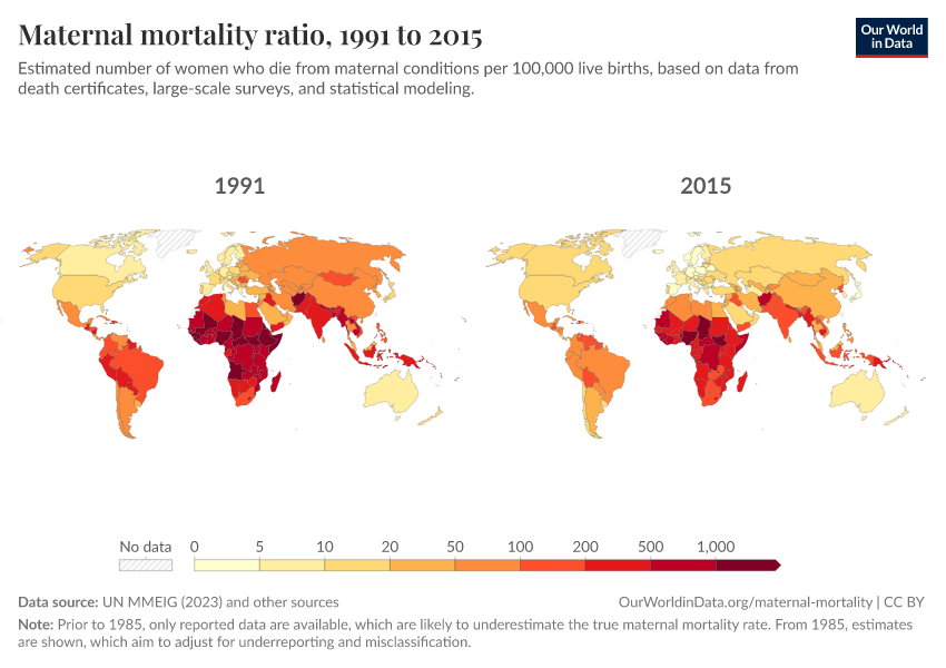 “Data Page: Maternal mortality ratio”, part of the following publication: Max Roser and Hannah Ritchie (2013) - “Maternal Mortality”. Data adapted from UN MMEIG (WHO, UNICEF, UNFPA, World Bank Group and UNDESA/ Population Division), WHO Mortality Database, United Nations, Gapminder. Retrieved from https://who-regions.owid.pages.dev:8789/20260304-094028/grapher/maternal-mortality.html [online resource] (archived on March 4, 2026).How to cite this data