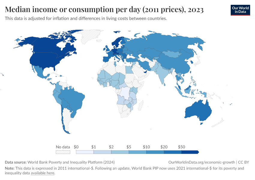 World Bank Poverty and Inequality Platform (2024) – with major processing by Our World in Data. “Median income or consumption per day (2011 prices) – World Bank” [dataset]. World Bank Poverty and Inequality Platform, “World Bank Poverty and Inequality Platform (PIP) 20240627_2017, 20240627_2011” [original data]. Retrieved March 9, 2026 from https://who-regions.owid.pages.dev:8789/20260304-094028/grapher/median-income-or-consumption-per-day-2011-prices.html (archived on March 4, 2026).
