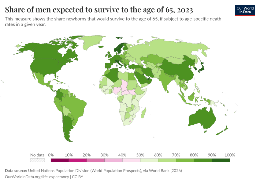 “Data Page: Share of men expected to survive to the age of 65”. Our World in Data (2026). Data adapted from United Nations Population Division (World Population Prospects), via World Bank. Retrieved from https://who-regions.owid.pages.dev:8789/20260304-094028/grapher/men-survival-to-age-65.html [online resource] (archived on March 4, 2026).How to cite this data