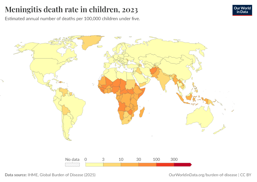 IHME, Global Burden of Disease (2025) – with major processing by Our World in Data. “Meningitis death rate in children” [dataset]. IHME, Global Burden of Disease, “Global Burden of Disease - Deaths” [original data]. Retrieved March 9, 2026 from https://who-regions.owid.pages.dev:8789/20260304-094028/grapher/meningitis-death-rates-children-under-5.html (archived on March 4, 2026).
