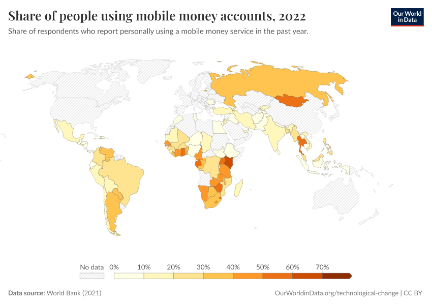 “Data Page: Share of people using mobile money accounts”, part of the following publication: Max Roser, Bertha Rohenkohl, Pablo Arriagada, Joe Hasell, Hannah Ritchie, and Esteban Ortiz-Ospina (2023) - “Economic Growth”. Data adapted from World Bank. Retrieved from https://who-regions.owid.pages.dev:8789/20260304-094028/grapher/mobile-money-account-usage.html [online resource] (archived on March 4, 2026).How to cite this data